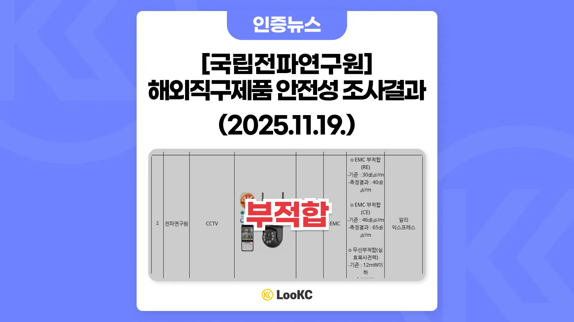 2 | 전파연구원 | CCTV | WiFi Smart Camera | EMC | o EMC 부적합(RE)-기준 : 30㏈㎶/m-측정결과 : 40㏈㎶/m o EMC 부적합(CE)-기준 : 46㏈㎶/m-측정결과 : 65㏈㎶/m o 무선부적합(실효복사전력)-기준 : 12mW이하-측정결과 : 52mW | 알리익스프레스 |