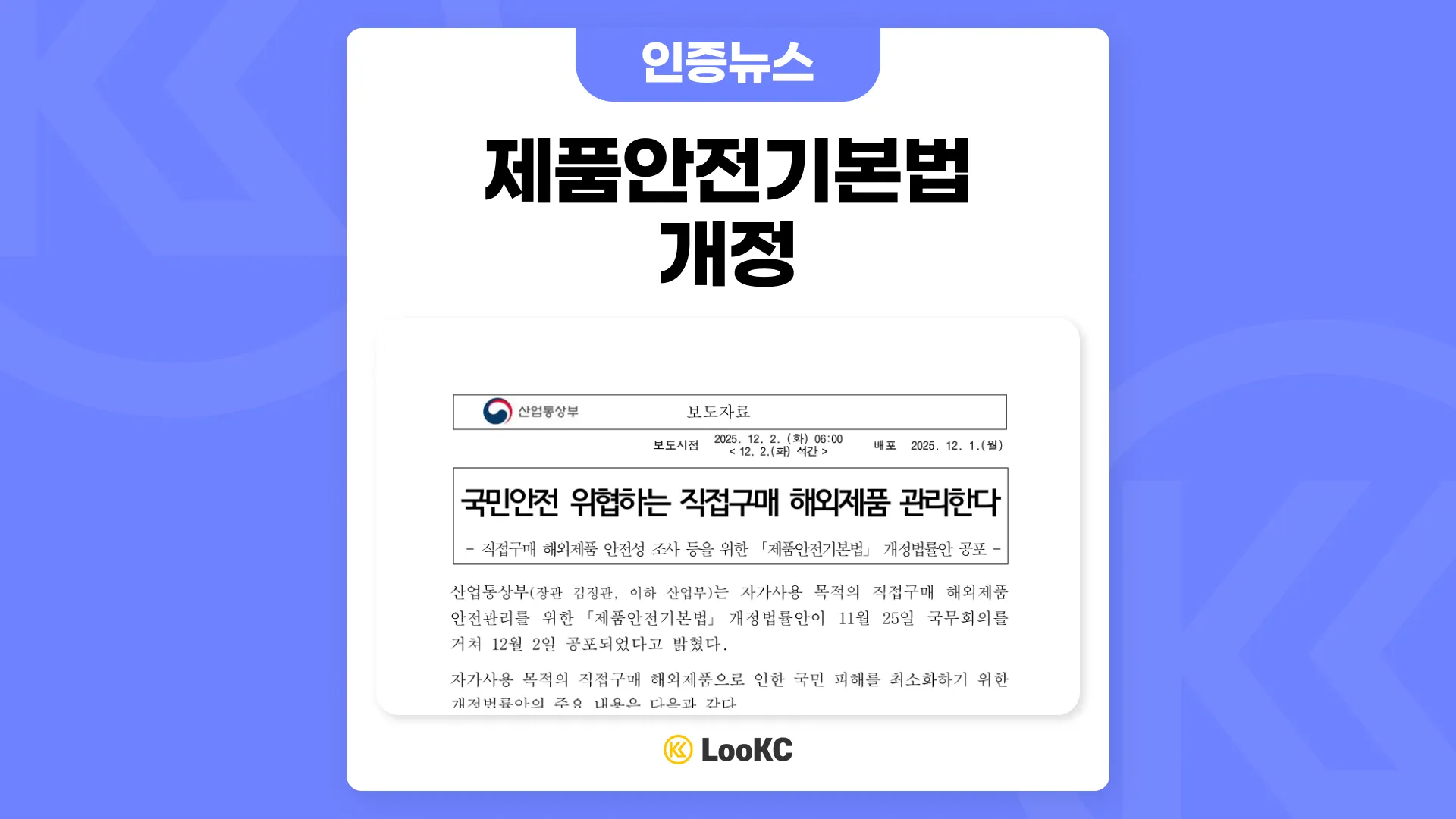 산업통상부(장관 김정관, 이하 산업부)는 자가사용 목적의 직접구매 해외제품 안전관리를 위한 「제품안전기본법」 개정법률안이 11월 25일 국무회의를 거쳐 12월 2일 공포되었다고 밝혔다.