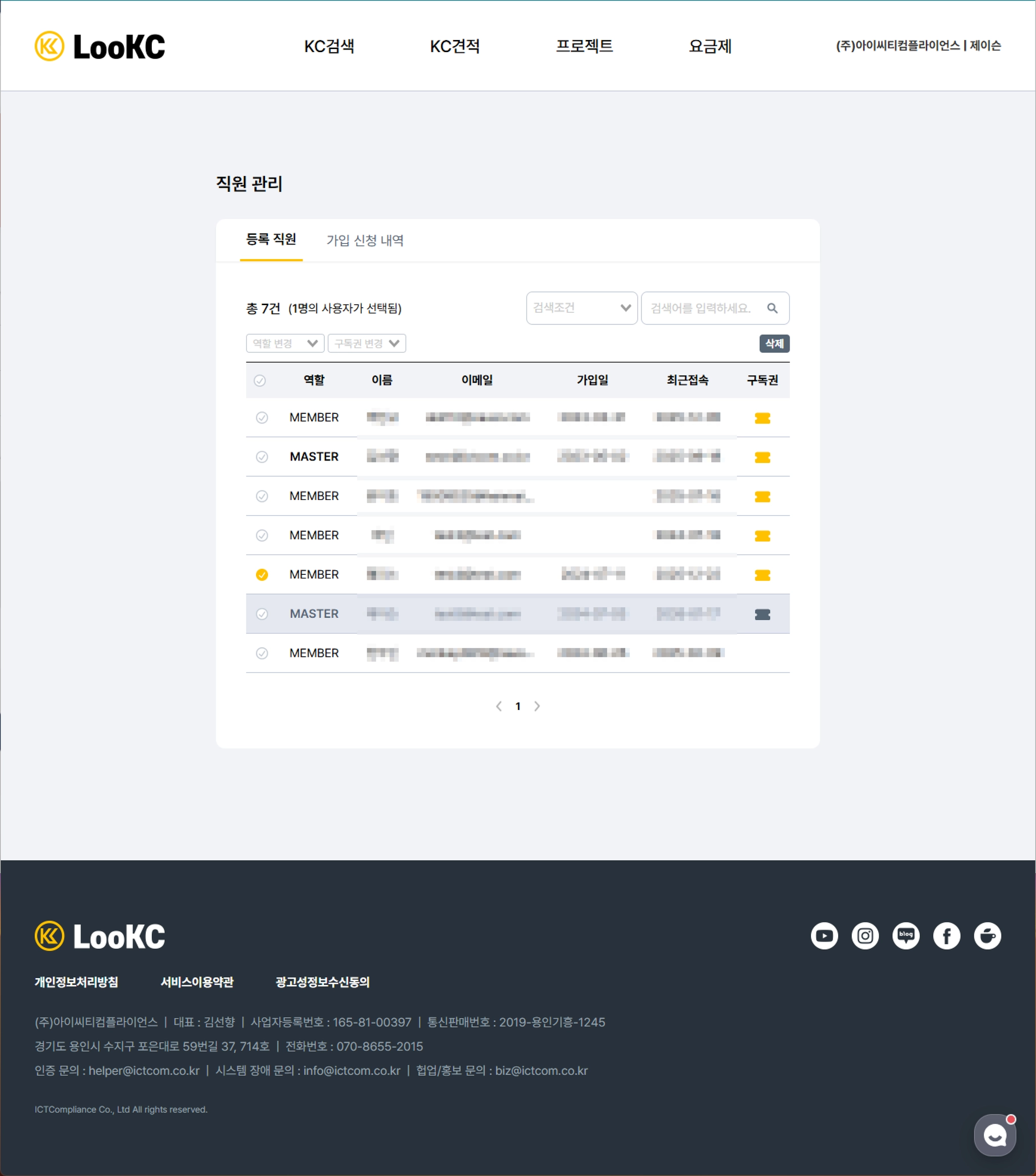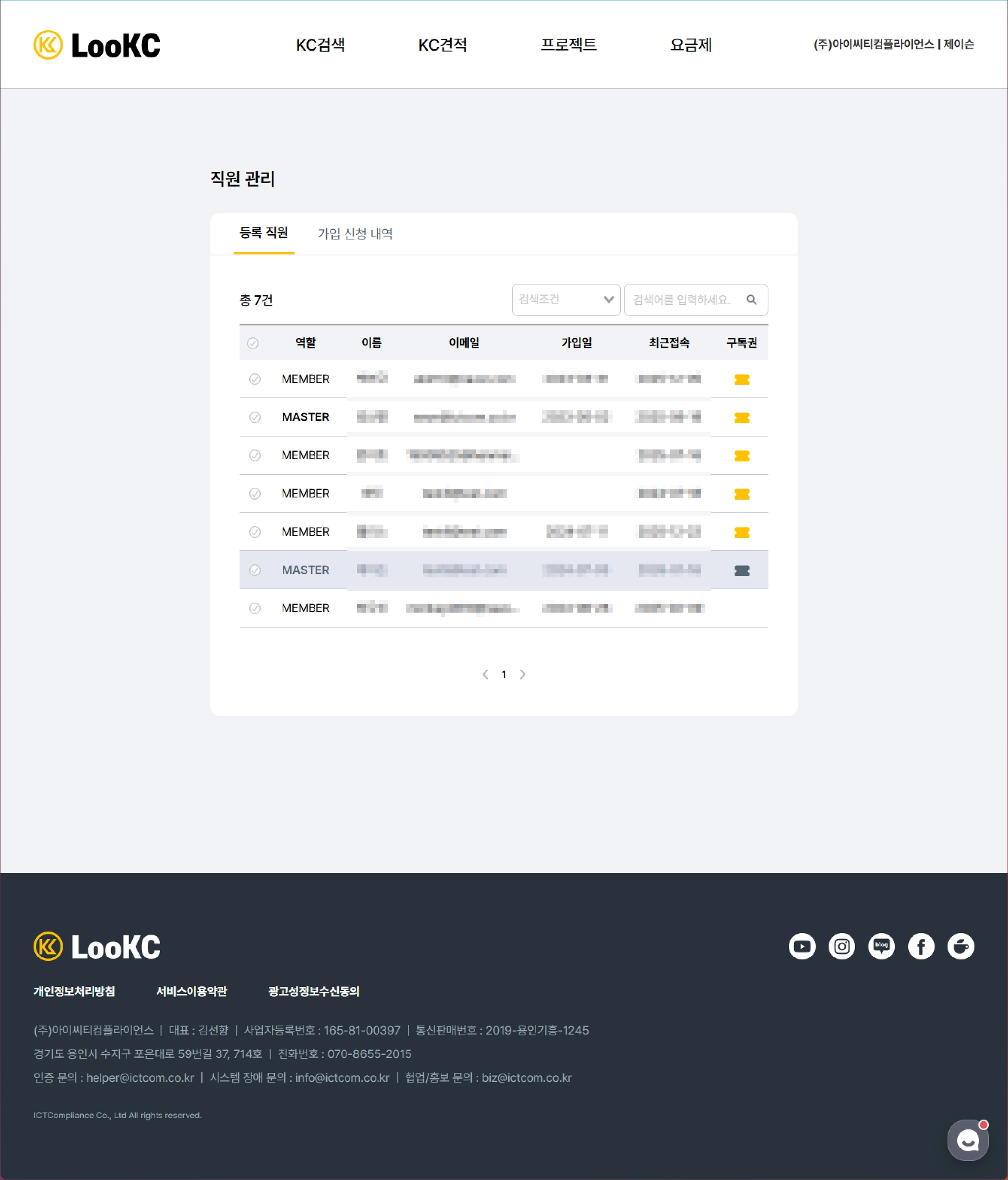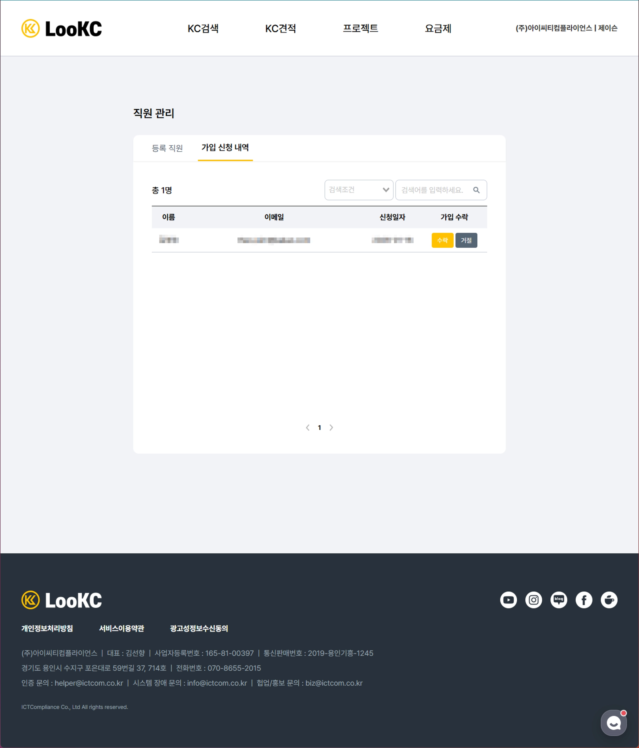 회사의 [MASTER] 계정은 회사로 가입을 신청한 내역을 확인하고 승인/내지 거절할 수 있습니다.