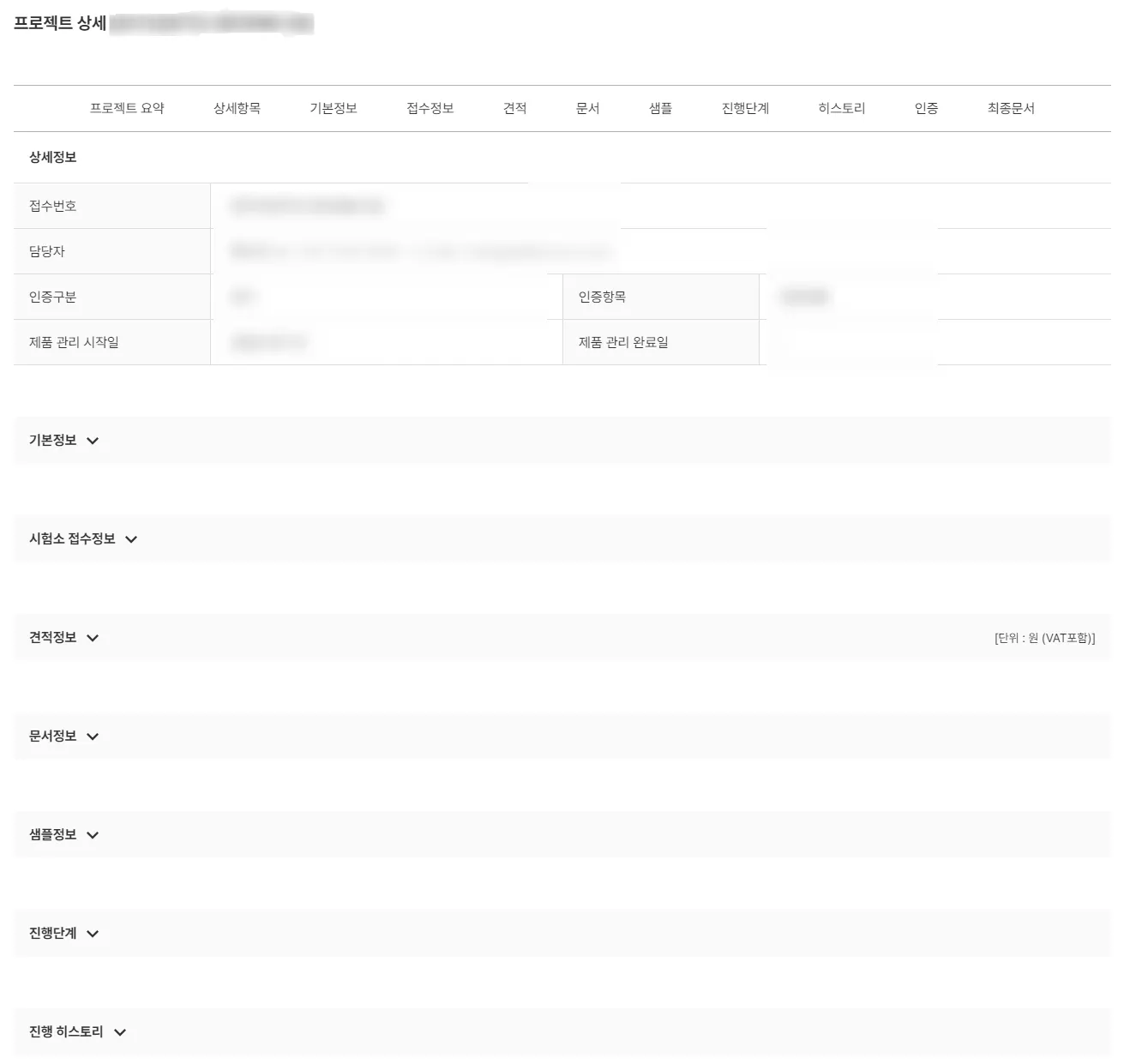 견적정보 : 개별 프로젝트(인증항목(시험항목))의 견적가와 입금일, 계산서 발행일을 확인할 수 있습니다.