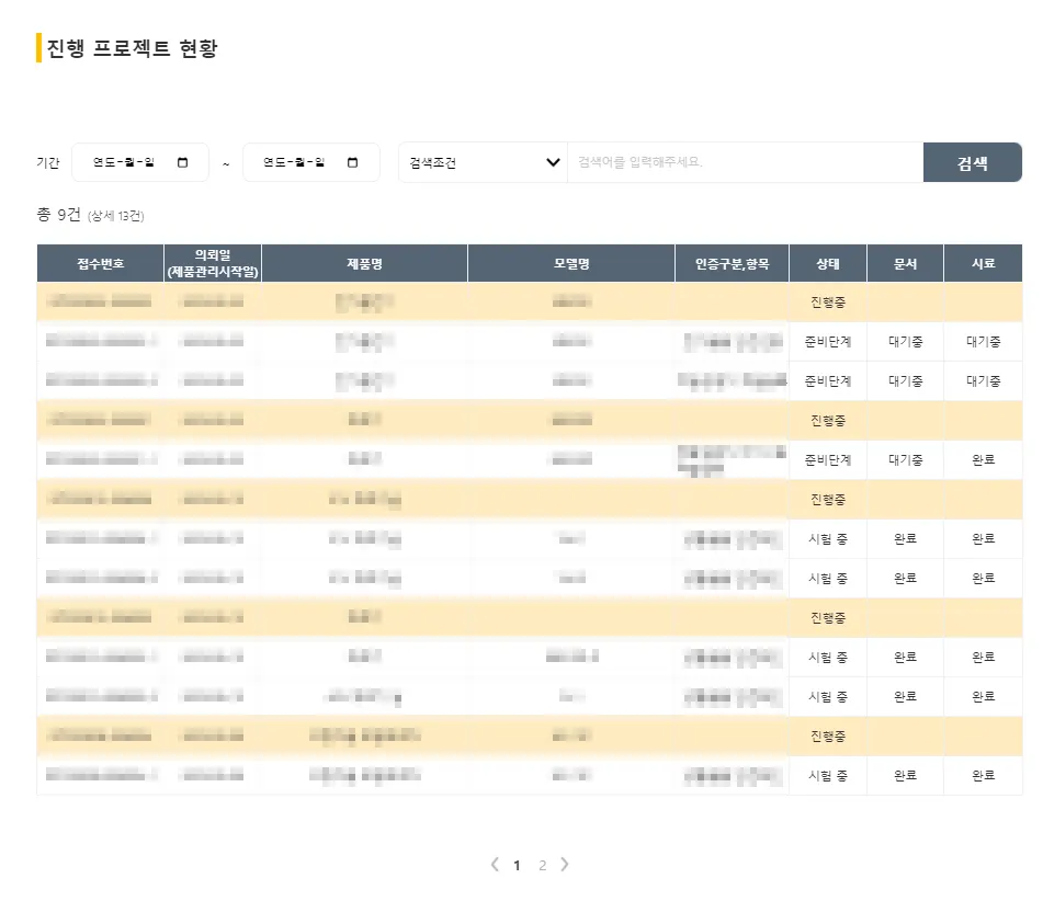 진행 중인 인증항목(시험항목)을 리스트로 확인할 수 있으며, 선택시 개별 프로젝트의 상세페이지로 이동합니다.