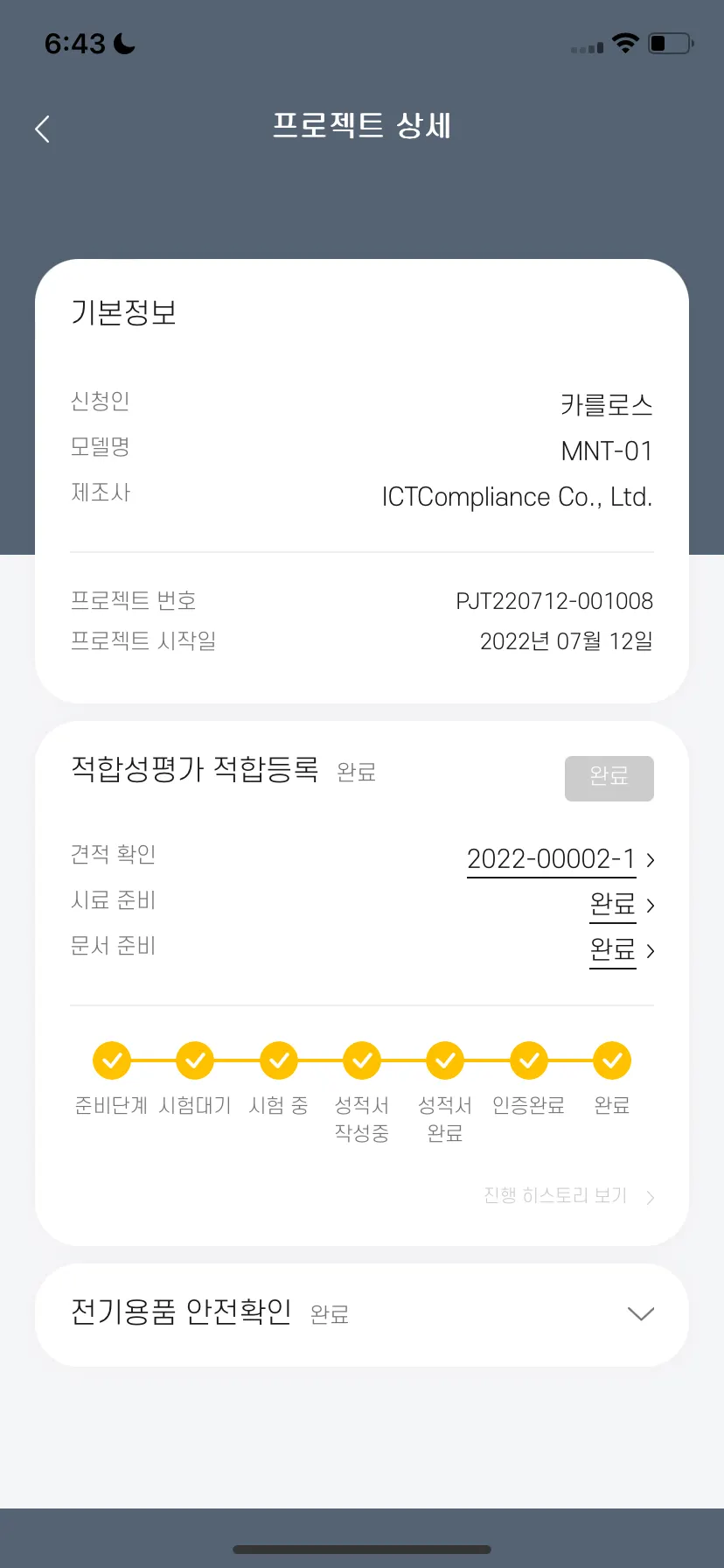 시료준비 : 인증 받을 제품 시료의 진행 사항을 알 수 있습니다.