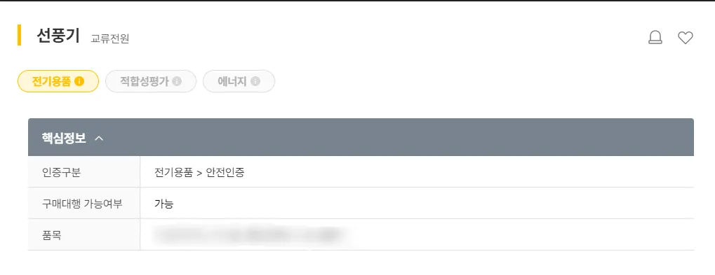 핵심정보에는 제품의 인증 구분과 구매대행 가능 여부, 품목에 대해 보여줍니다.